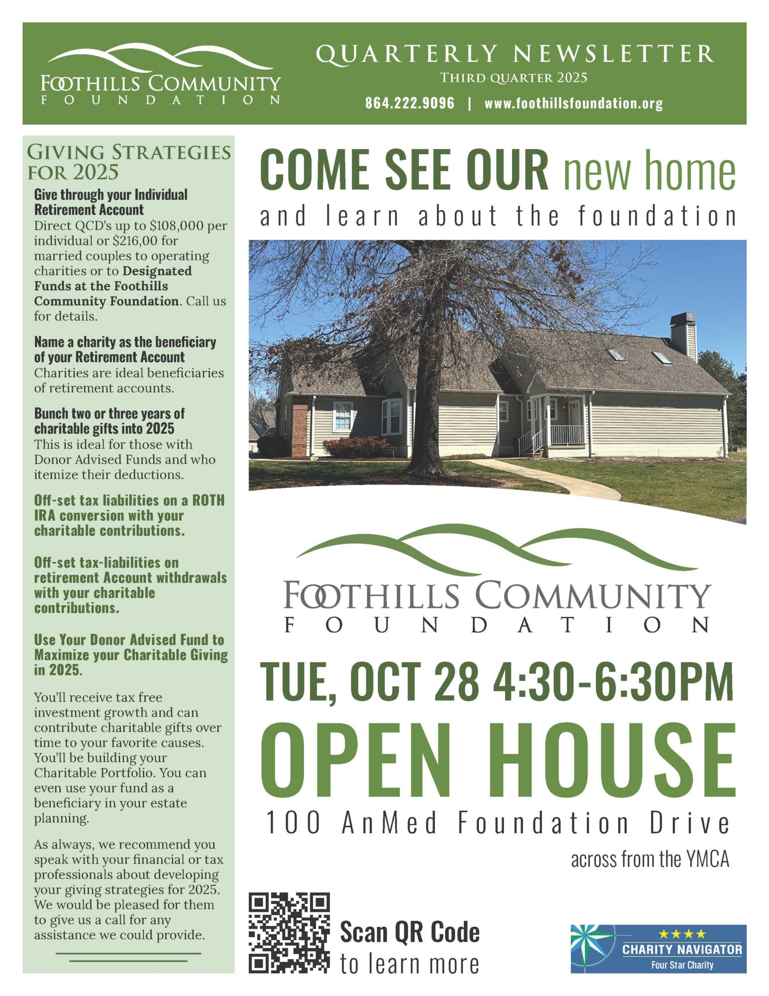 As the year draws to a close, it’s the perfect time to think about how your generosity can make the greatest impact — both for the causes you love and your own financial goals. At Foothills Community Foundation, we’re here to help you make those decisions with confidence.